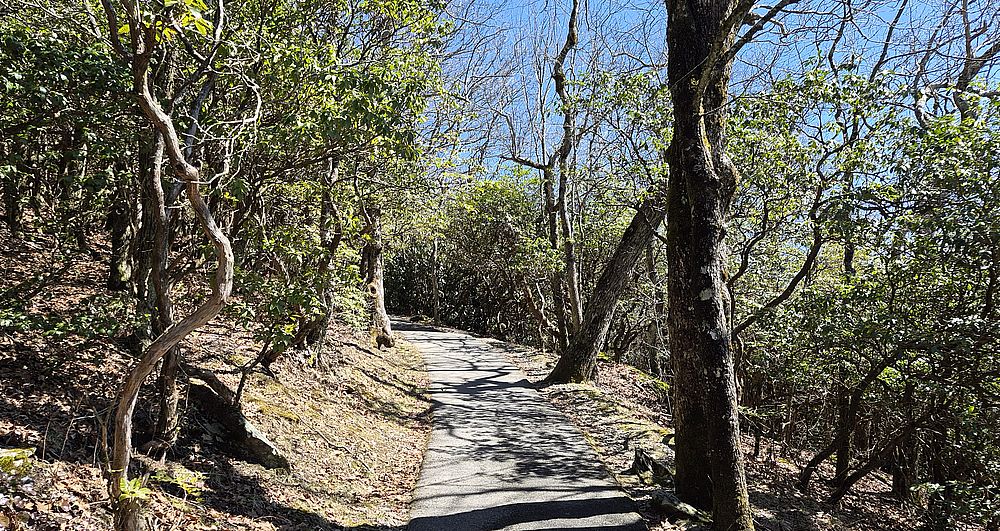 Nach der Anreise aus Alabama wird der Mietwagen auf den früh im März noch wenige genutzten Besucherparkplatz ab. Souvenirshop und Infrastrukturgebäude waren auch noch in der Winterpause. Der Trailhead ist gleich links vom Souvenirshop. Der meist asphaltierte und teilweise steile führt in einigen Serpentinen durch den Wald in etwa 15 Minuten zum Gipfel.